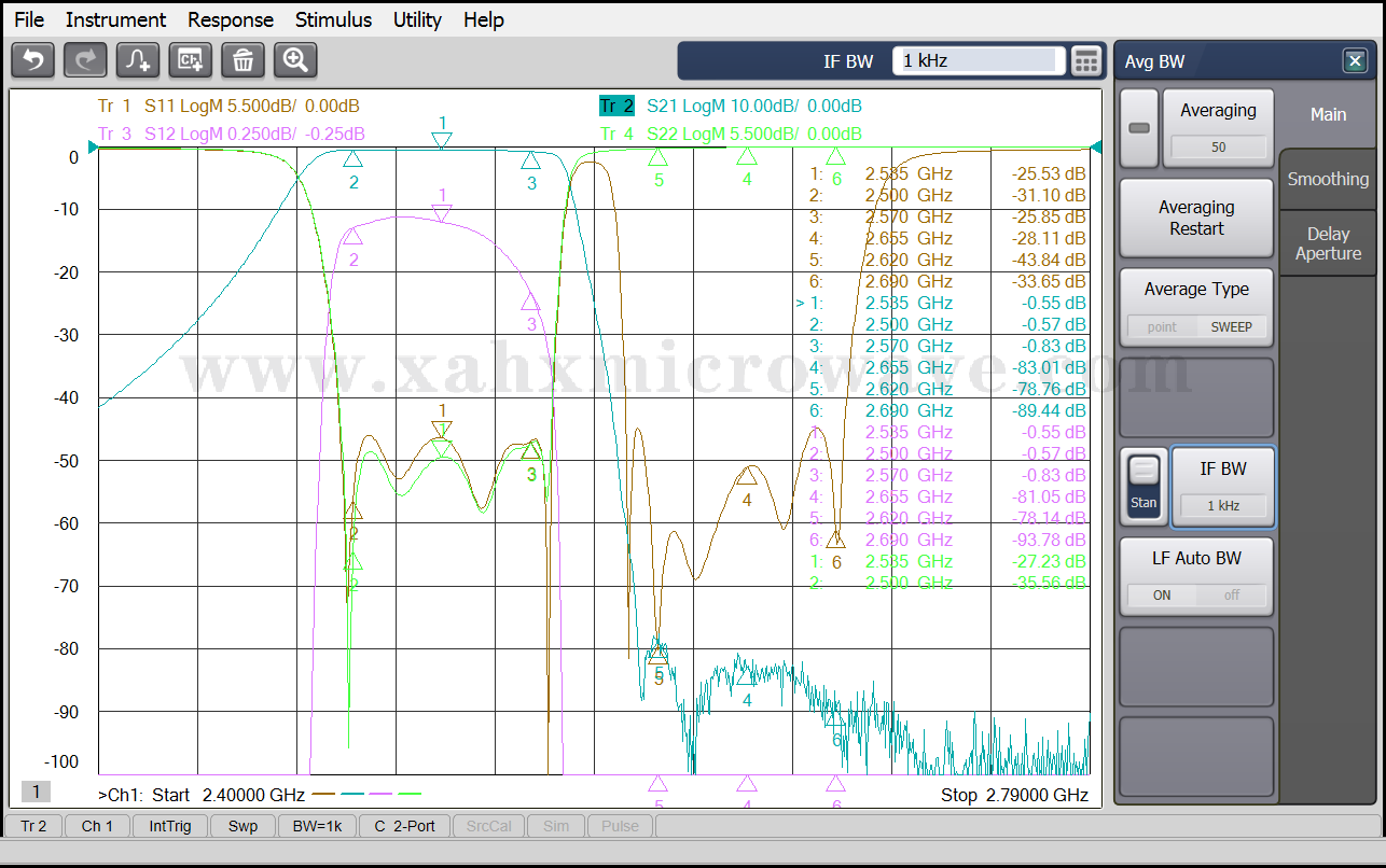 | ● | Stop Band Attenuation | ≥70dB @ 2620 ~ 2690MHz | ≥70dB @ 2500 ~ 2570MHz |
