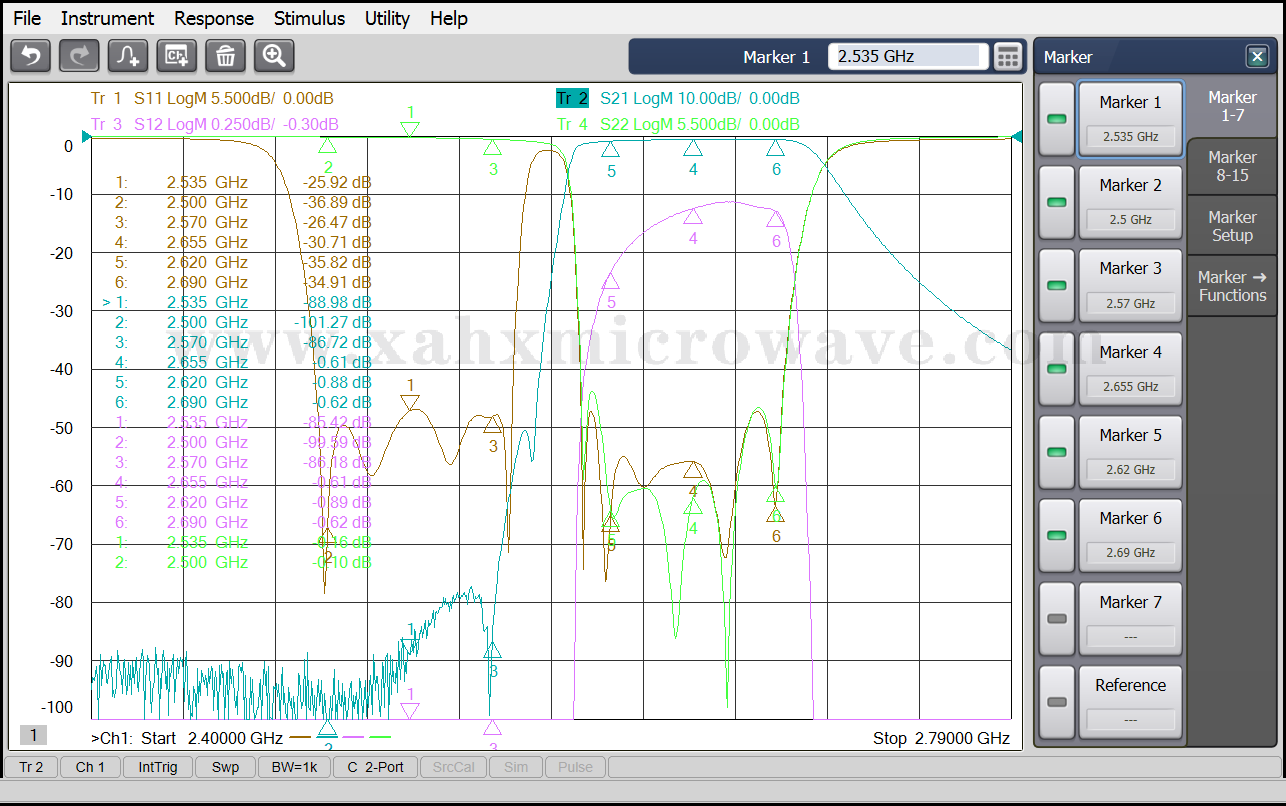 | ● | Stop Band Attenuation | ≥70dB @ 2620 ~ 2690MHz | ≥70dB @ 2500 ~ 2570MHz |